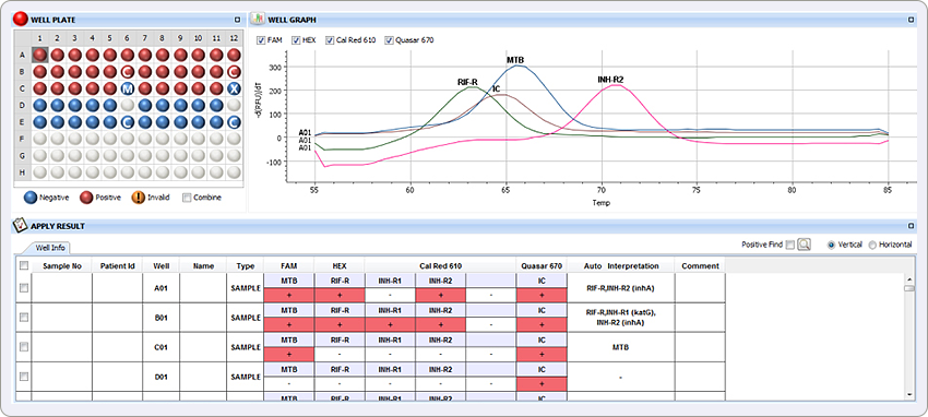 وتشير النتائج إلى الكشف عن الإصابة بـ MTB في القناة FAM، والطفرة المقاومة ل rifampicin في القناة HEX والطفرة المقاومة لـ isoniazid في القناة Cal Red 610.