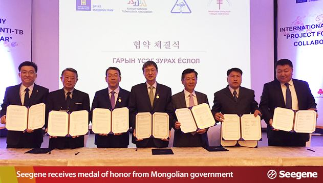 On September 4, 2017, Seegene CEO Jong-Yoon Chun received a medal of honor from Mongolia’s Ministry of Health and Welfare at the “Signing Ceremony for Project for Korea-Mongolia Anti-TB Collaboration in Ulaanbaatar” that was held at Holiday Inn Ulaanbaatar.